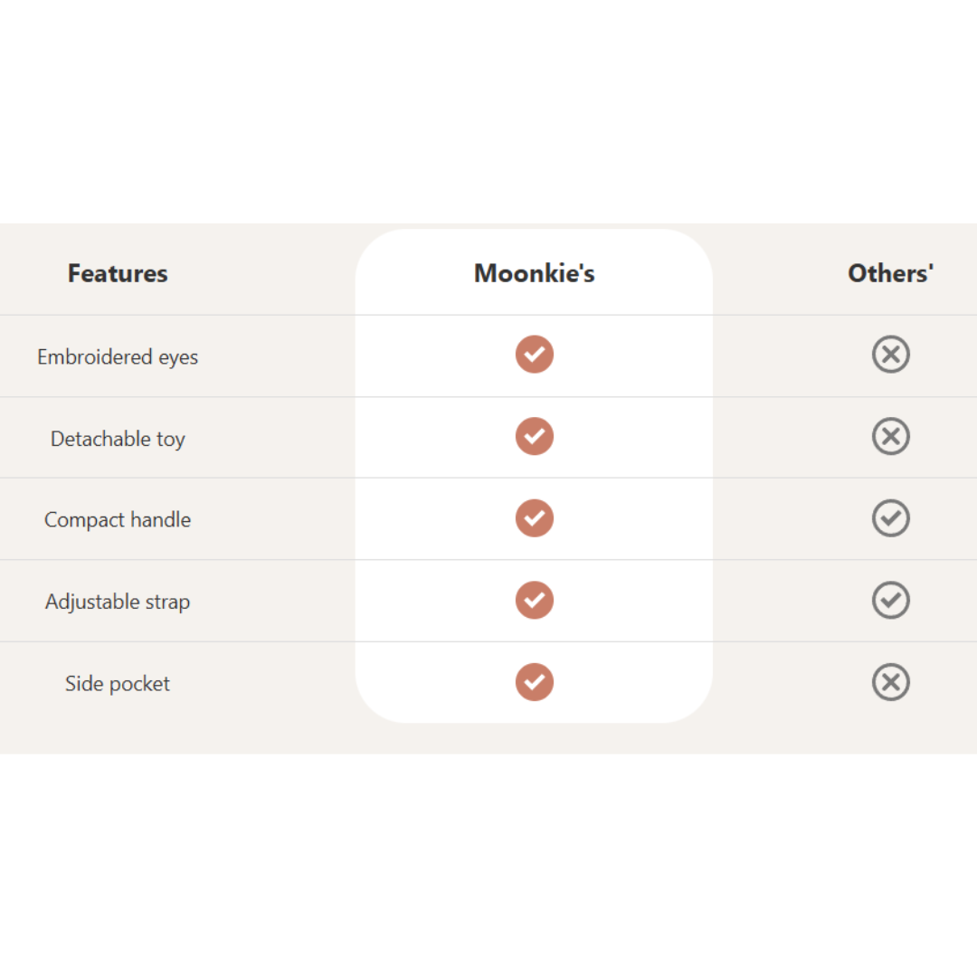Moonkie Barnabakpoki – Rosie Kanína sameinar bakpoka og leikfang í einni vöru. Rosie kanínan er mjúkur og fjarlægjanlegur félagi, fullkominn fyrir leik, ferðalög og svefn. Hentar börnum 18 mánaða og eldri.