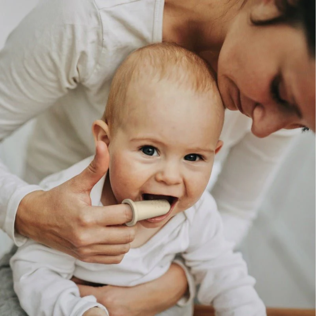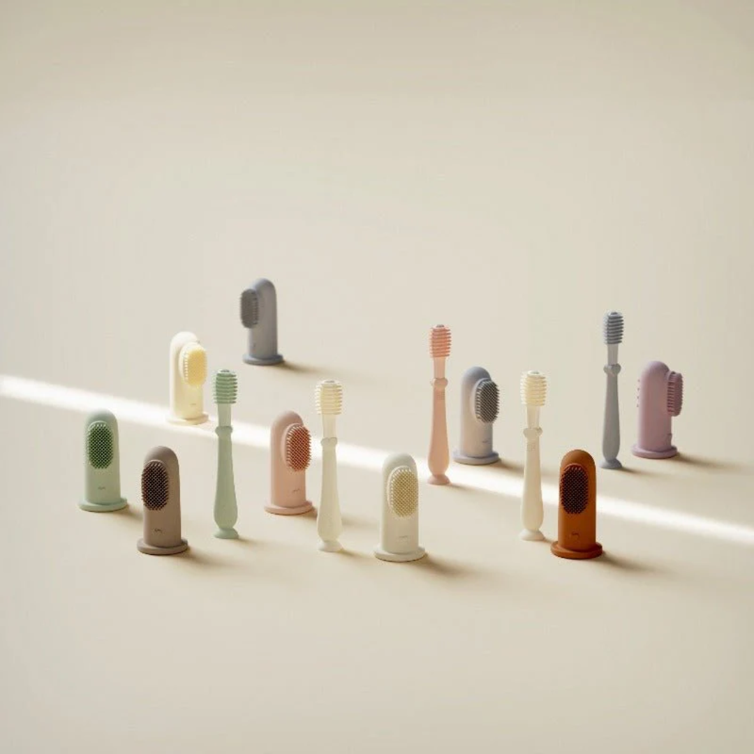 Moonkie Tannburstasett – fingurbursti og tunguhreinsir úr sílikoni hjálpar foreldrum að leggja góðar grunnvenjur í munnhirðu barnsins frá fyrstu mánuðum.