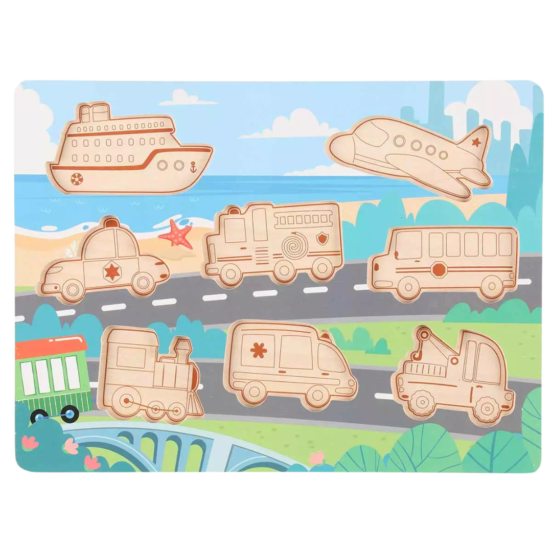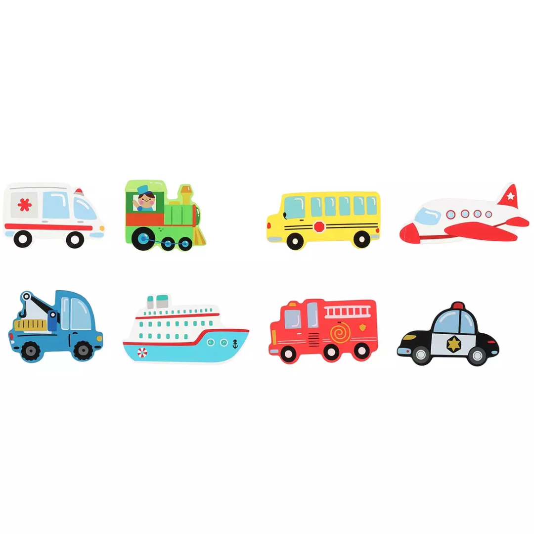 Þetta viðarpúsl með umferðar- og farartækjaþema er bæði fræðandi og skemmtilegt fyrir börn. Á púslinu eru 8 mismunandi farartæki, sem kveikja áhuga barna á umferð, faratækjum og umhverfinu í kringum þau.